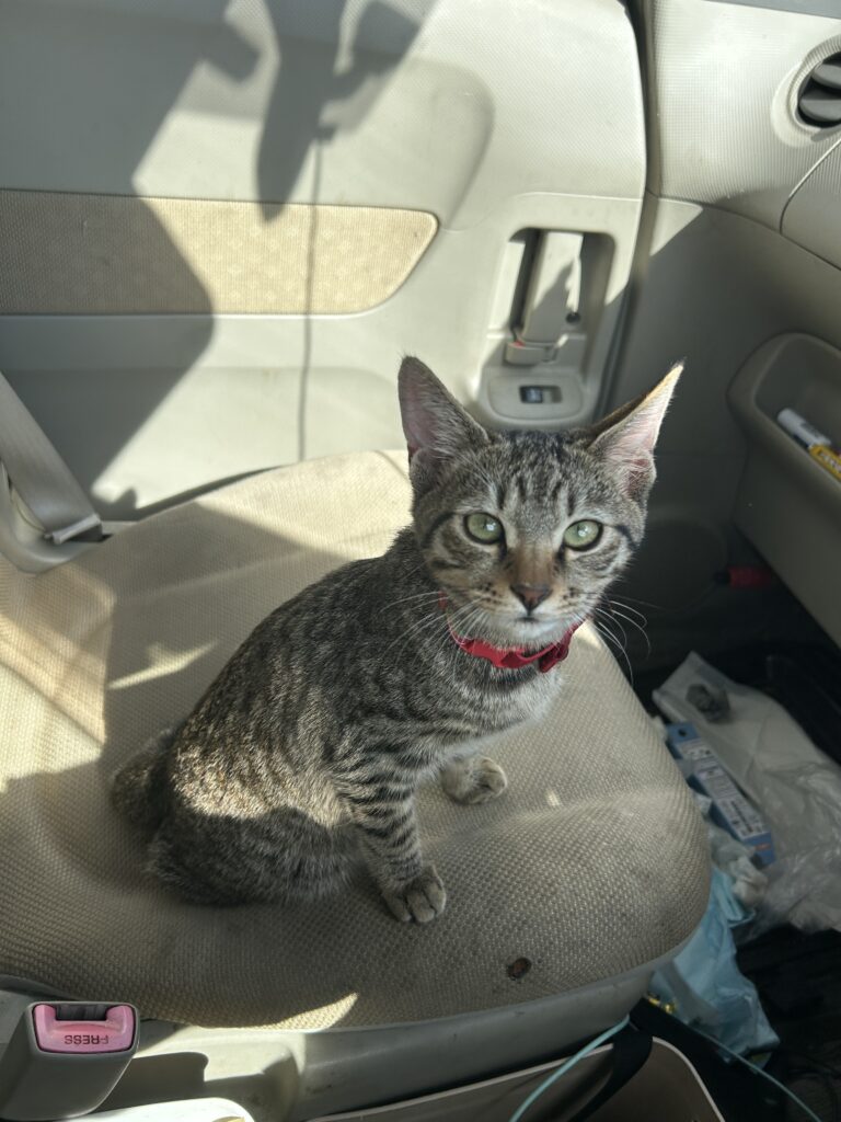 11月23日午前11時前に、笠岡市篠坂PAにて熊本のトラックドライバーさんから保護の連絡が有りました。花柄のピンクの首輪、折れ曲がった短い尻尾が特徴です。キジトラ柄3,4か月の♀猫です。人懐っこいので無事捕獲出来ております。寒くて震えていたようです。心当たりの方はご連絡ください。